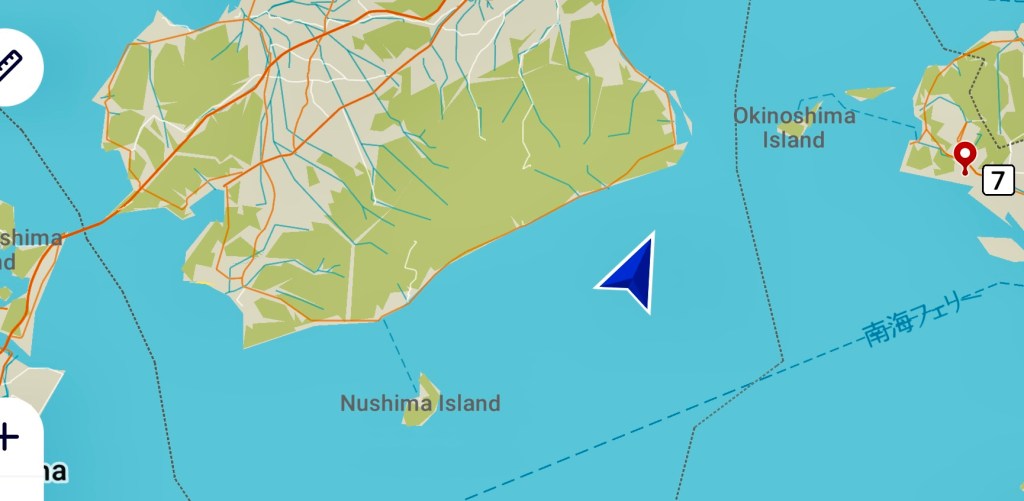 Screen shot half way to Nushima Island (center) from Isonoura (red dot on right). Paddled on to Nurito (far left), after camping on Nushima. 30 plus 20 km.