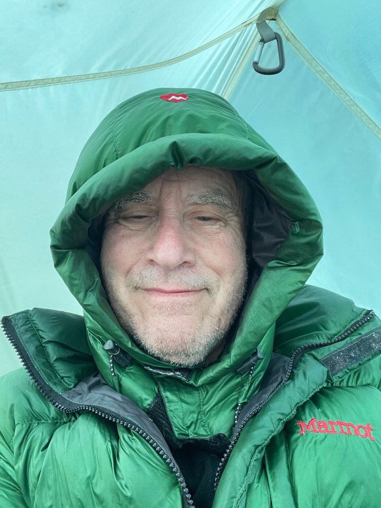 La tempête a frappé, et j’ai à peine eu le temps d’installer le camp. Cependant, je suis resté au sec, juste au-dessus de la marée haute sur une plate-forme rocheuse faite maison. Vagues hautes et lancement difficile le lendemain matin.